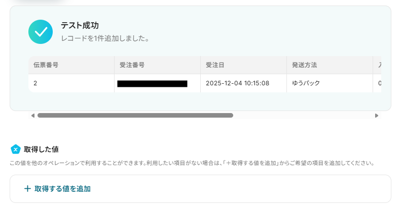取得した値:Google スプレッドシートに追加したい項目を選択