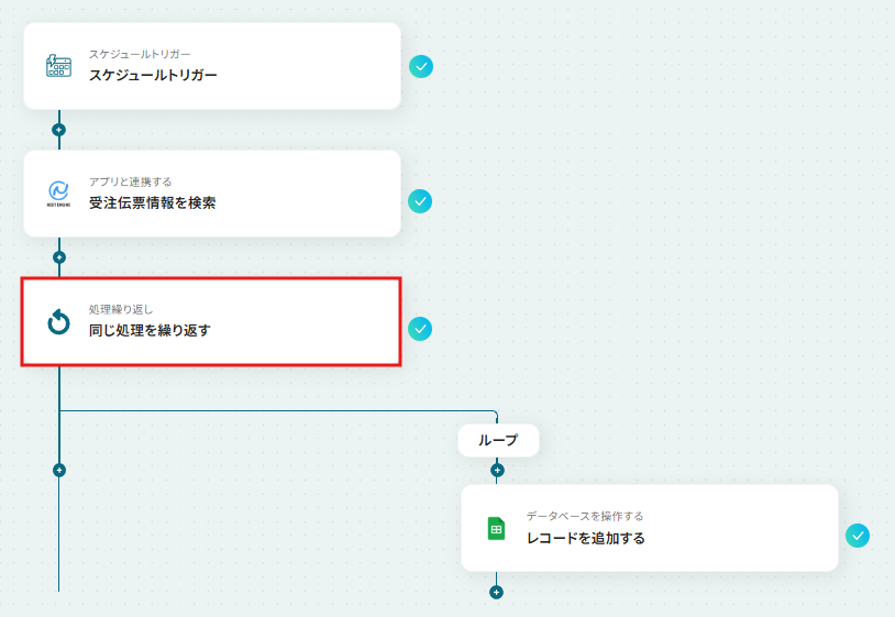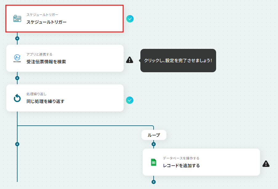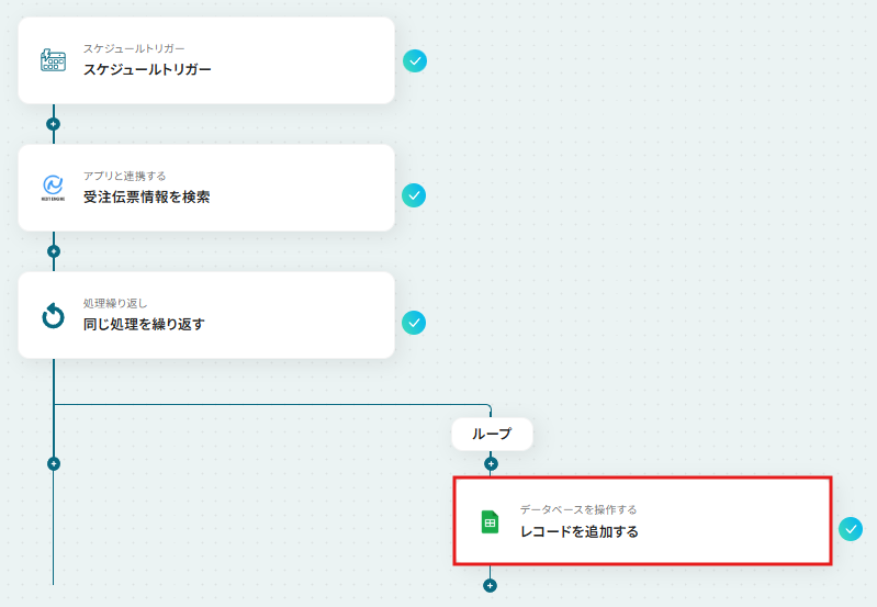 スケジュールトリガーでは、毎日や毎週など、ワークフローを実行する頻度や時間帯を任意で設定してください。 Google スプレッドシートにレコードを追加するアクションで、受注情報を記録したいスプレッドシートやシートを任意で設定してください。 ■注意事項