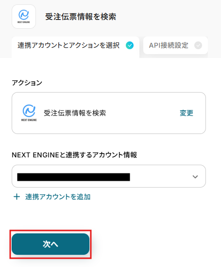 ステップ4:NEXT ENGINEの設定 次に、アクションとして「データベースを操作する」の中からNEXT ENGINEを選択し、「受注伝票を検索する」オペレーションを設定します。 まずはNEXT ENGINEでトリガーとなる動作を行っておきましょう。 今回はこのように受注伝票を作成しました。今はテスト段階なので、内容は架空のものでかまいません。