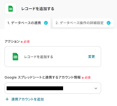 ステップ6:Google スプレッドシートのアクション設定 テンプレートの最後「レコードを追加する」を開きます。