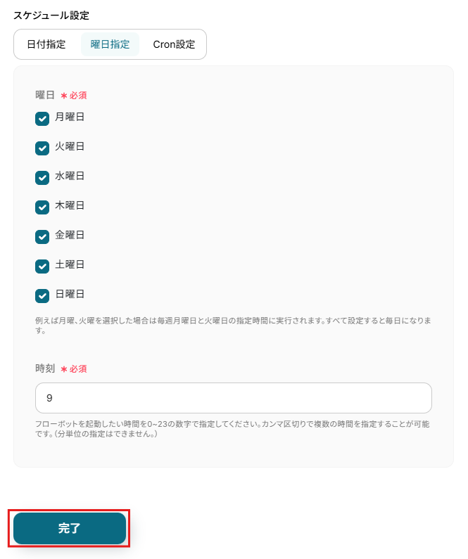 実行したいスケジュールに合わせて間隔や日時などを設定し、「完了」をクリックしてください。