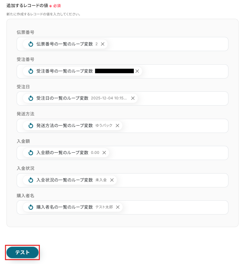 設定したら「テスト」をクリックして実行します。