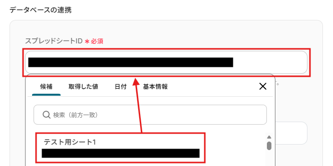スプレッドシートID / スプレッドシートのタブ名:入力欄をクリックすると候補が表示されるので、該当するものを選択してください。