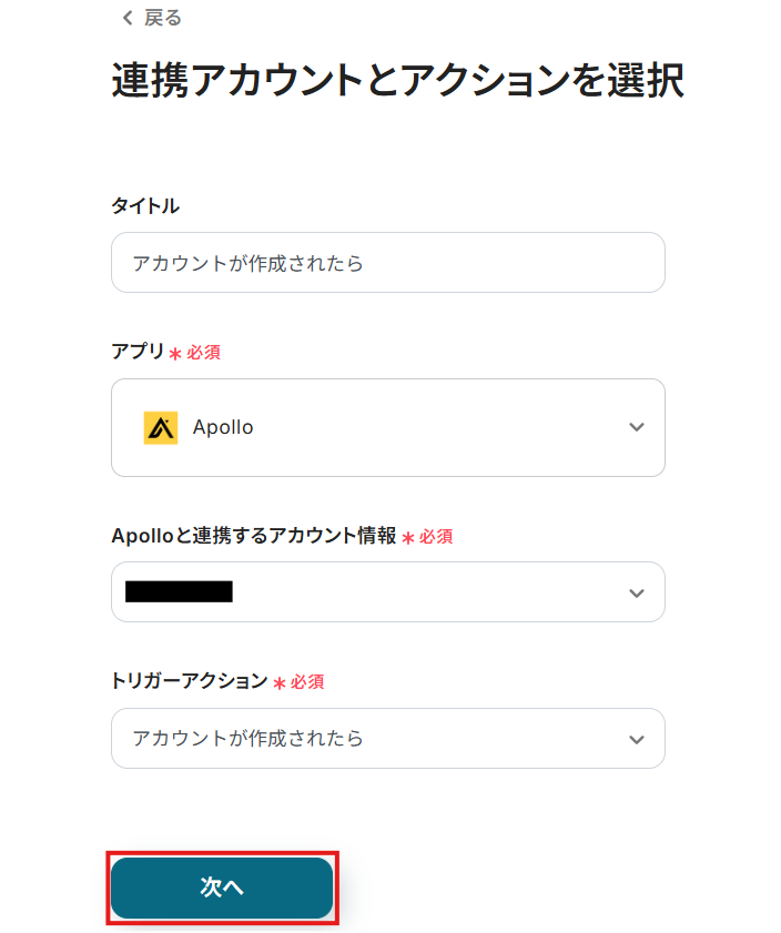 - 次に、トリガーでApolloを選択し、「アカウントが作成されたら」というアクションを設定します。