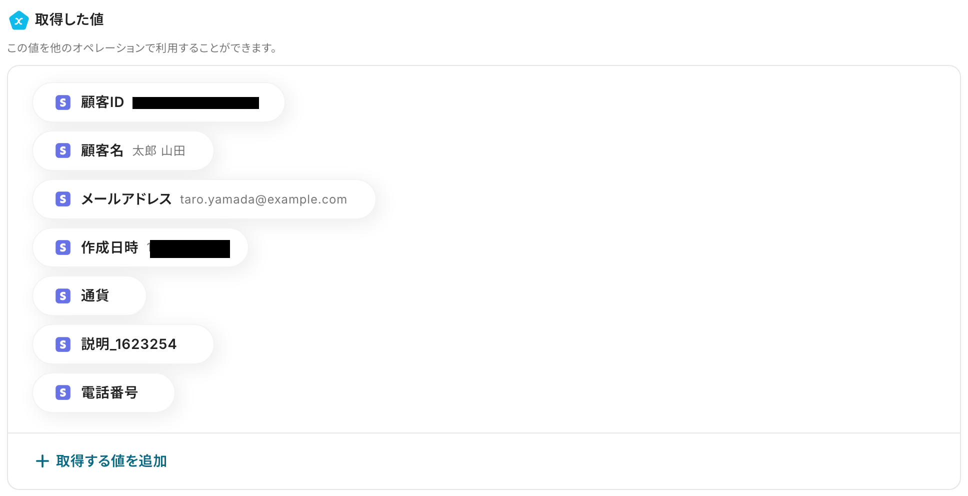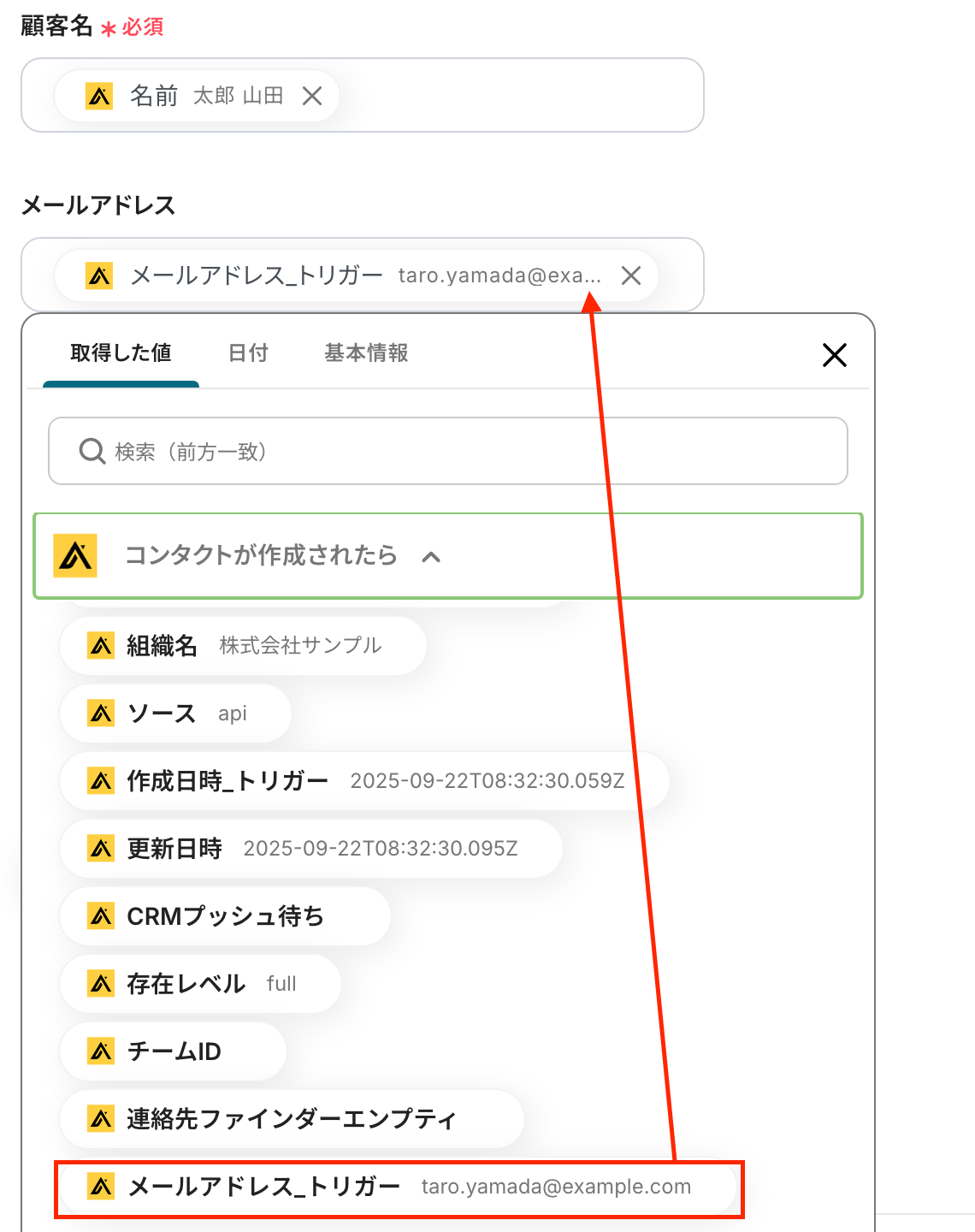 「顧客名」や「メールアドレス」などの項目には、先ほど取得した値を引用してください。