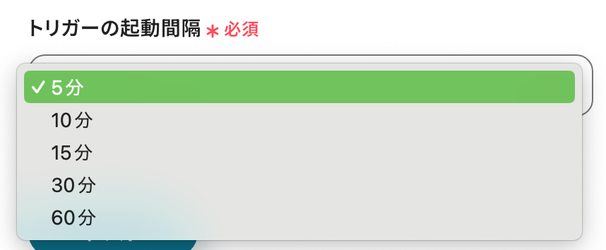 「トリガーの起動間隔」は、5分、10分、15分、30分、60分から選択できます。