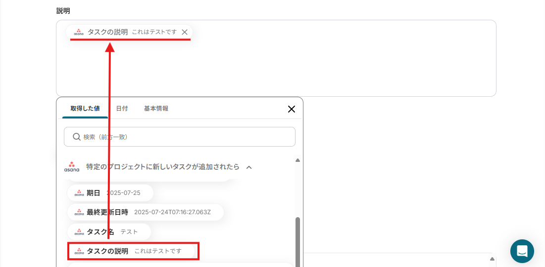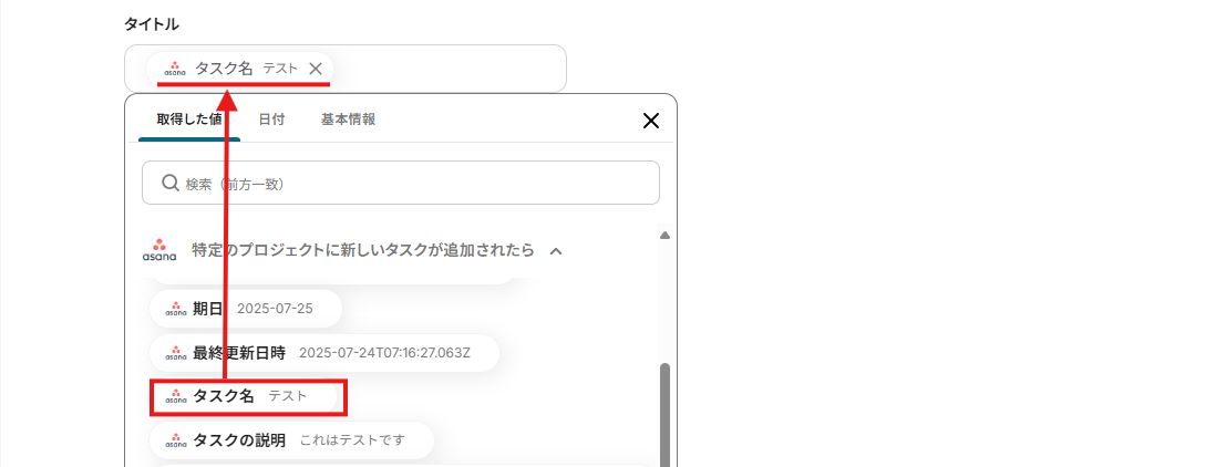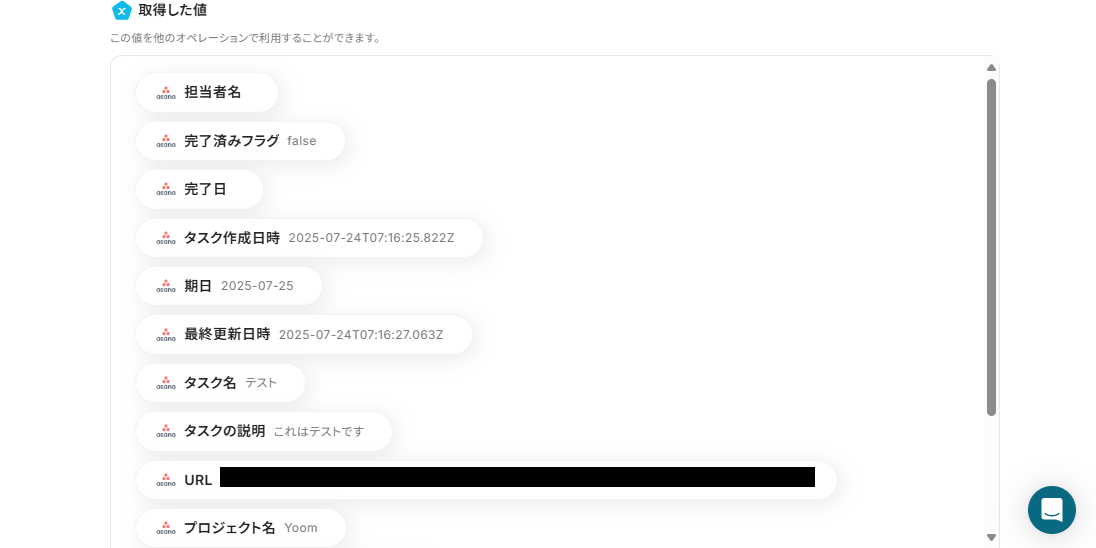 テストが成功すると、先ほどAsanaで作成したタスクの情報が取得した値(アウトプット)に表示されます。