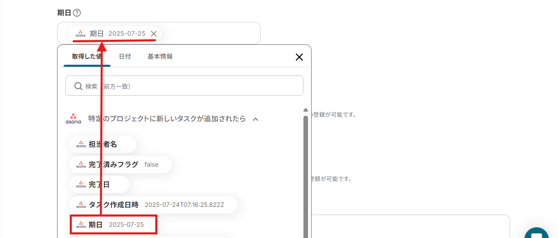 期日もAsanaで登録した期日が反映されるように設定してあるので、そのまま進みます。