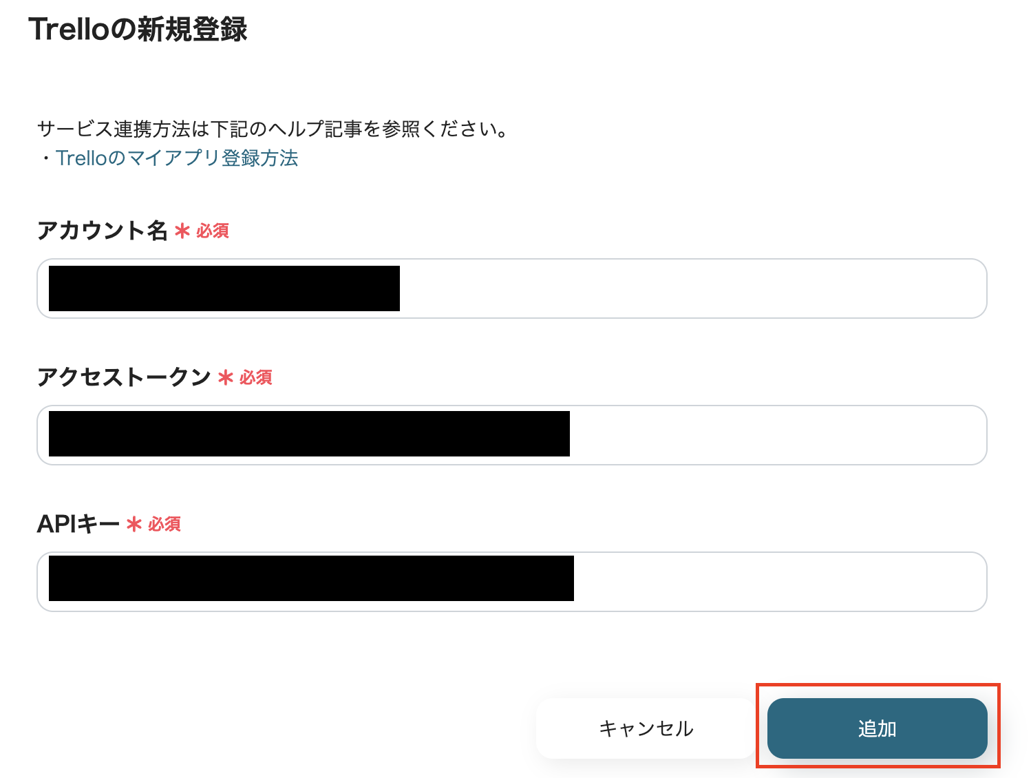 Trelloの新規登録画面で「アカウント名」と「アクセストークン」、「APIキー」を入力後に「追加」をクリックしてください。