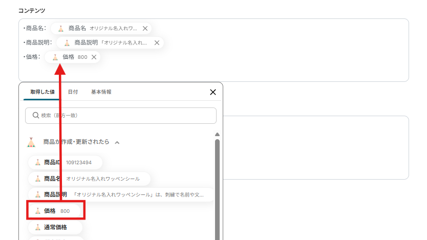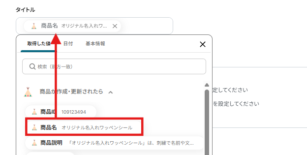 タイトルには今回、BASEから取得した値より「商品名」を選択しました。