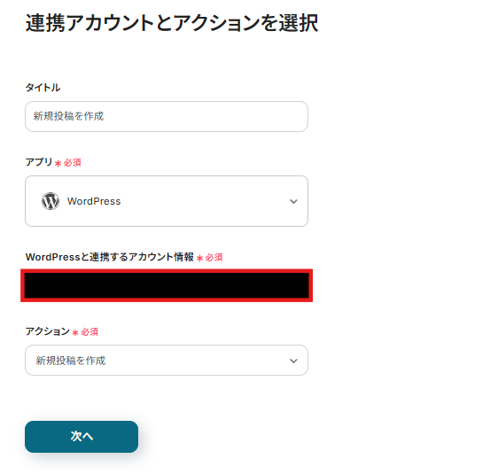連携アカウントとアクションを選択する画面が表示されるので、今回連携するWordPressのアカウントを確認し「次へ」をクリックします。