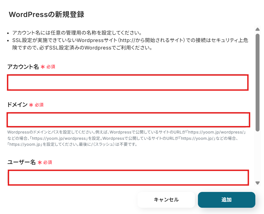 以下の画面が表示されるので、注釈に従って入力し、入力後「追加」をクリックします。