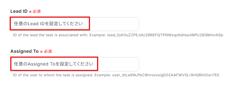 「Lead ID」「Assigned To」は、Closeの画面から確認し、入力してください。