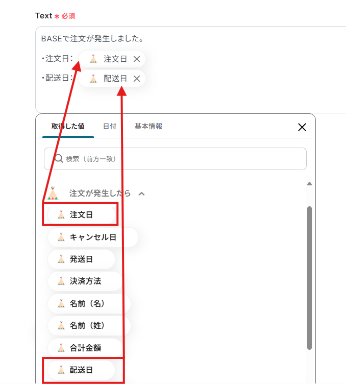 「Text」は、入力欄をクリックして表示される取得した値から選択してください。