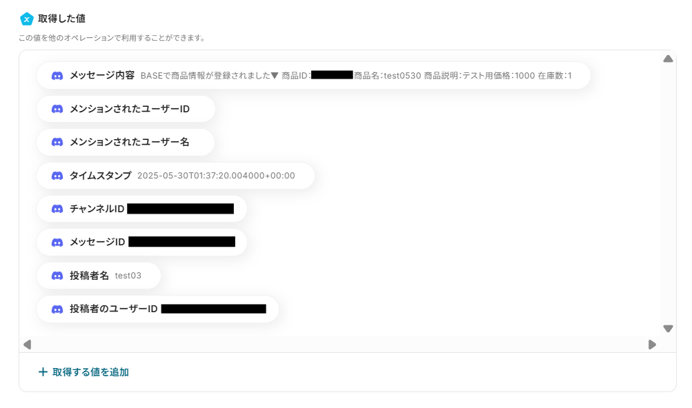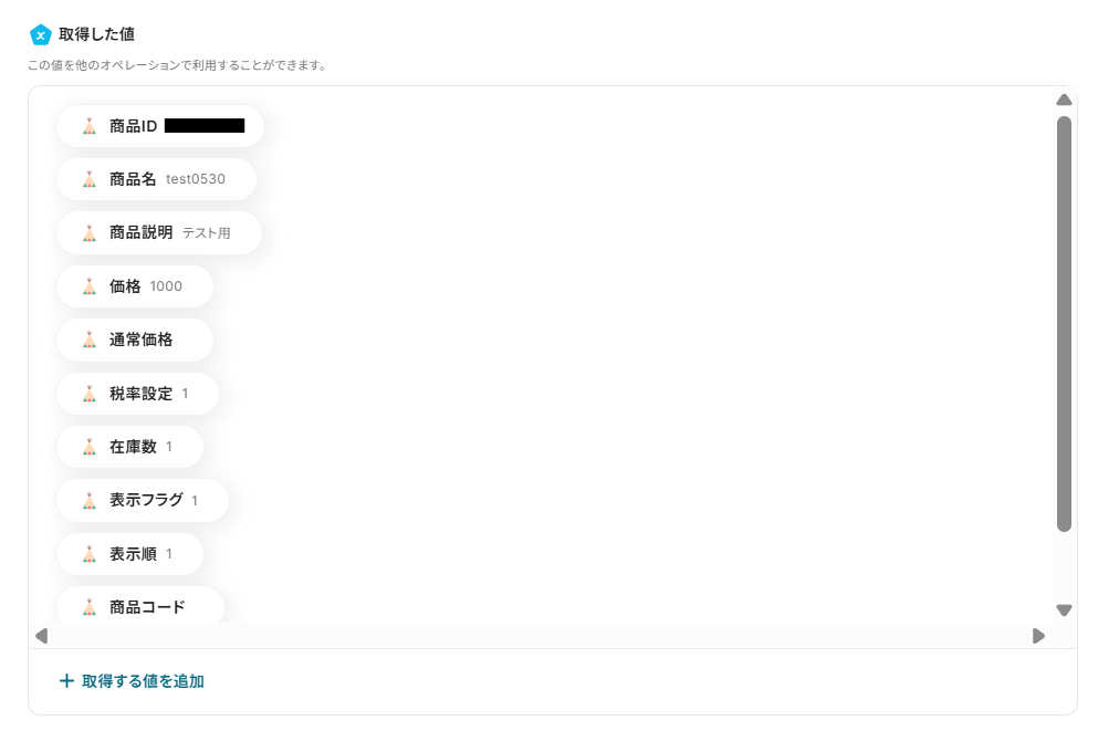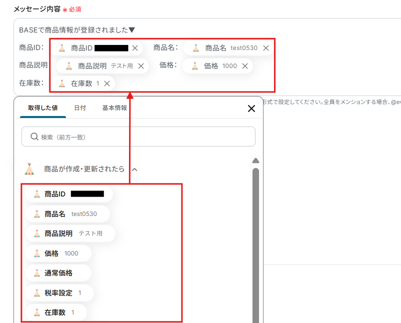 商品情報(商品ID、商品名、商品説明、価格、在庫数)などの変動する値は、取得した値(アウトプット)から入力します。