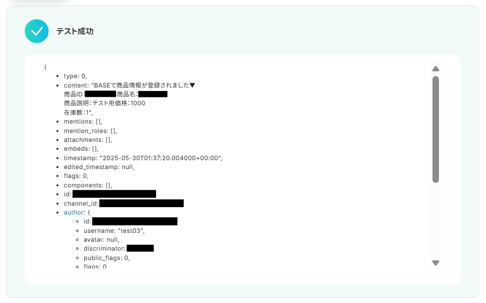設定したら、BASEで商品の新規作成を行ってから「テスト」をクリックします。テストが成功すると、以下のように情報を取得できます。