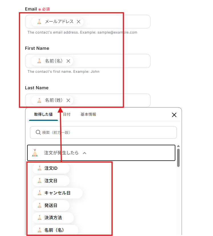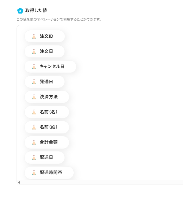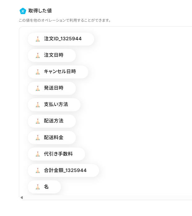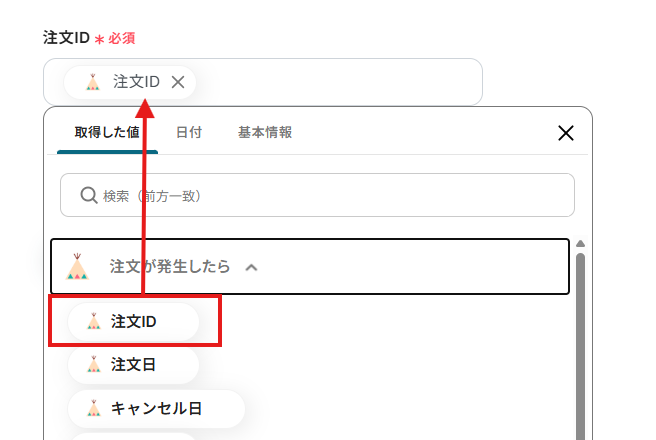 「注文ID」は、入力欄をクリックして表示される取得した値から選択してください。