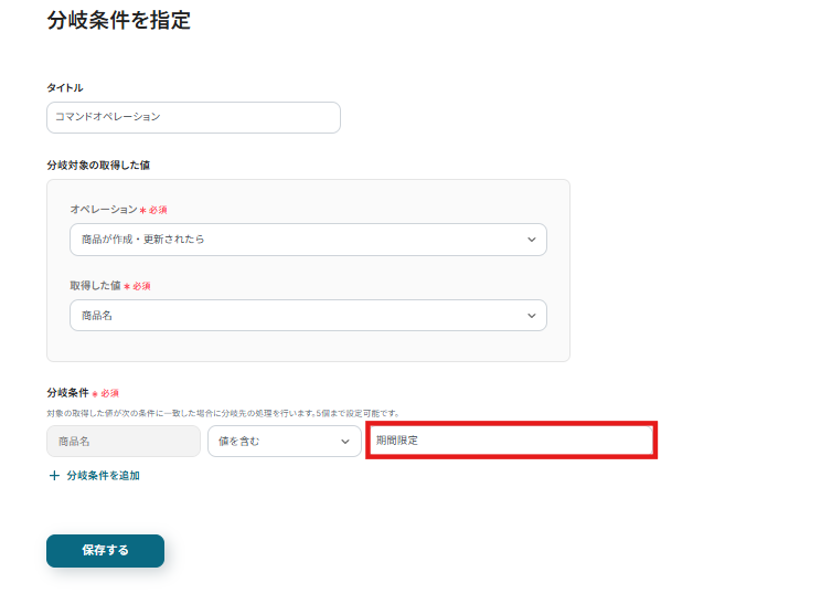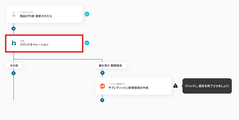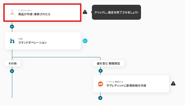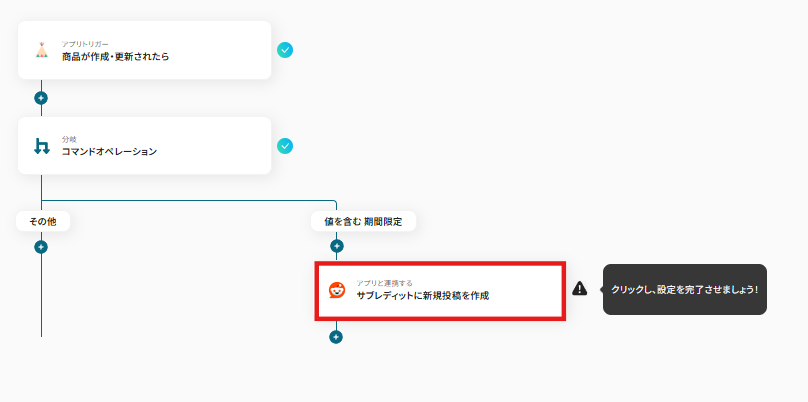 今回は赤枠の箇所に「期間限定」と入力し、BASEで期間限定の商品が新規作成・更新された際にRedditのフローへ進むように設定しました。