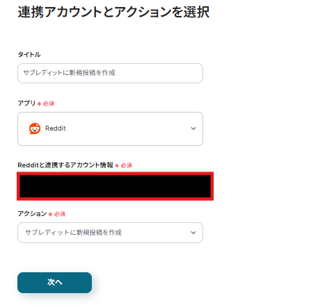 連携アカウントとアクションを選択する画面が表示されるので、今回連携するRedditのアカウントを確認し「次へ」をクリックします。