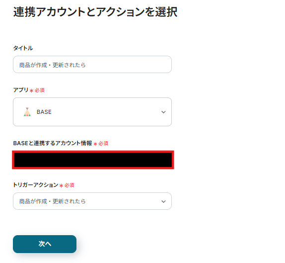連携アカウントとアクションを選択する画面が表示されるので、今回連携するBASEのアカウントを確認し「次へ」をクリックします。