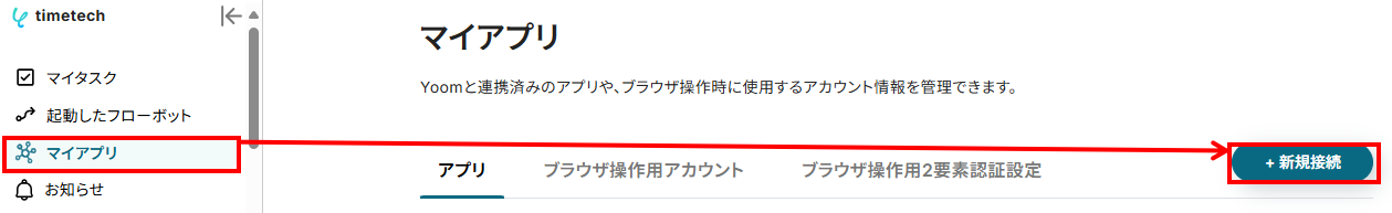 まず、Yoomにログインしたあと左メニューにあるマイアプリを押し、右の新規接続というボタンを押します。