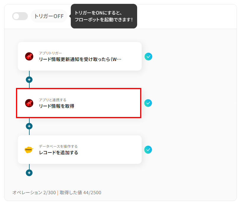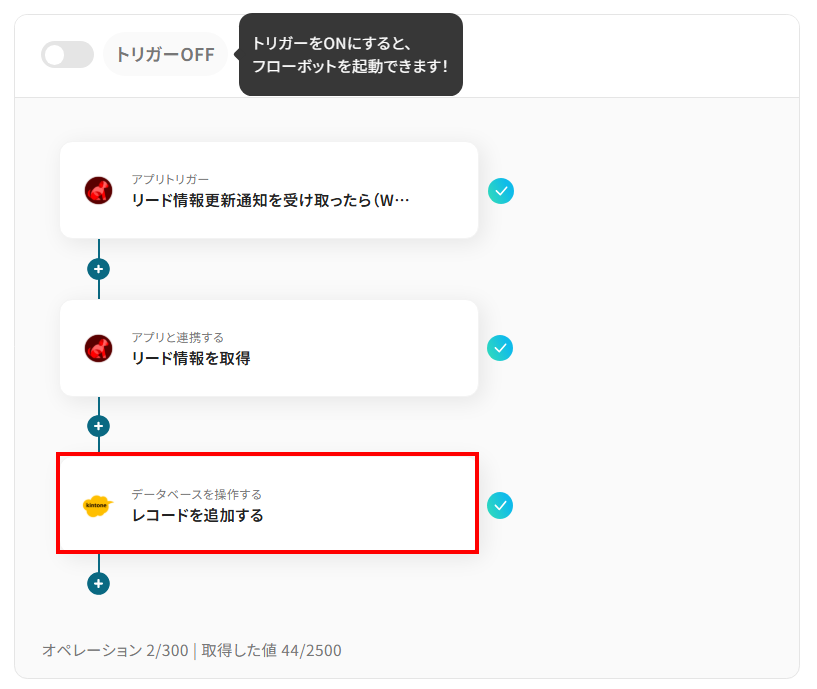 これにより、新しいリード情報を手動でkintoneに入力する手間が省け、迅速なフォローアップが可能になるため、リードナーチャリングの効率を大幅に向上させることができます。