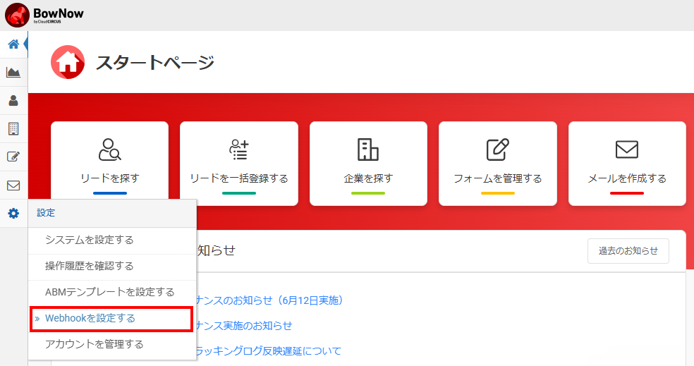 1.続いて、BowNowのリード情報を取得する設定を行います。下記赤枠をクリックしてください。