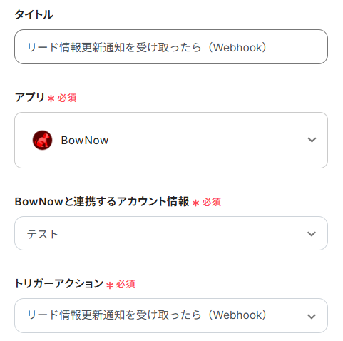 アクションは、テンプレート通りに「リード情報更新通知を受け取ったら(Webhook)」のままで大丈夫です。