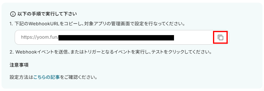 まずは、下記赤枠を押してWebhook URLをコピーしてください。