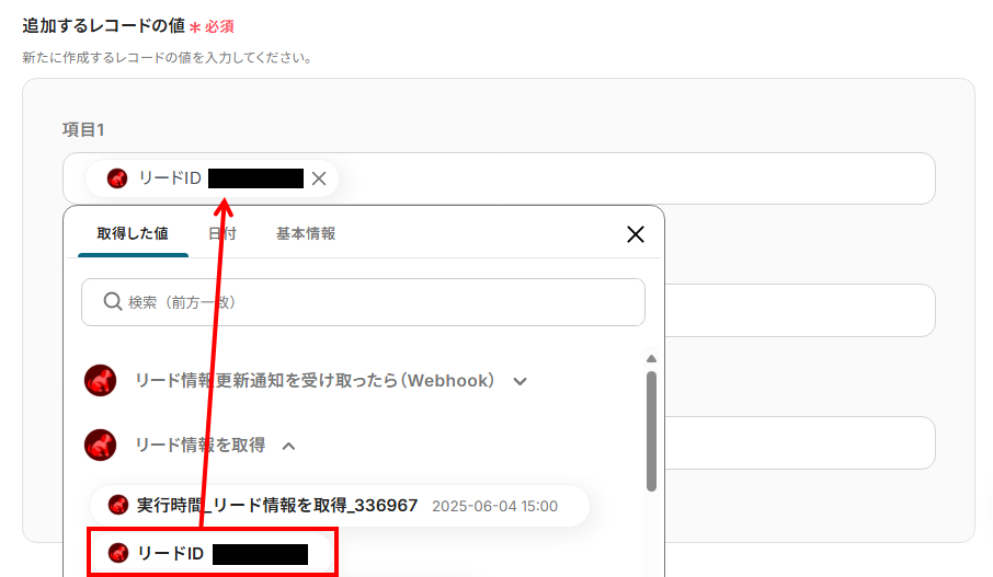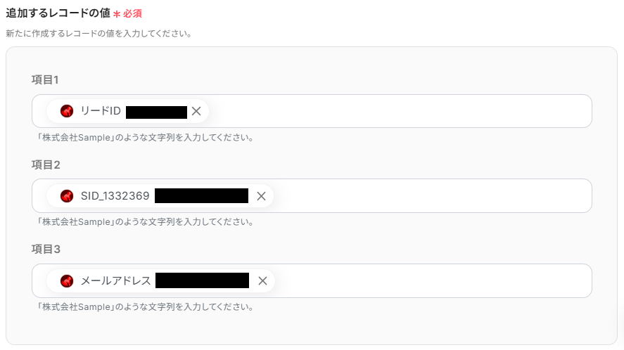 「追加するレコードの値」の、それぞれの項目欄をクリックすると下記のようなアウトプットが表示されます。お好みに合わせて、それぞれの項目を入力してください。
