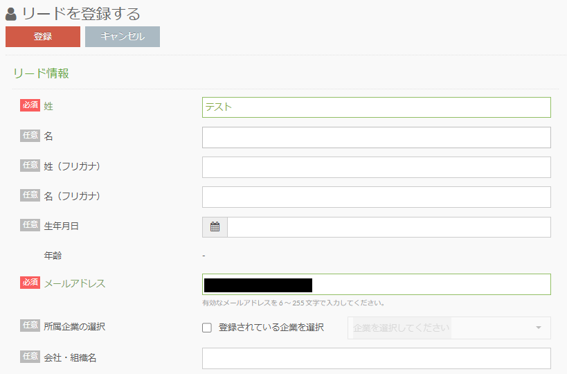 Webhookイベントの設定が完了したら、この後のテスト操作でリード情報が更新されている必要があるので、架空の情報(「テスト株式会社」や「テスト太郎」など)で良いので、リードを新規登録してみましょう。