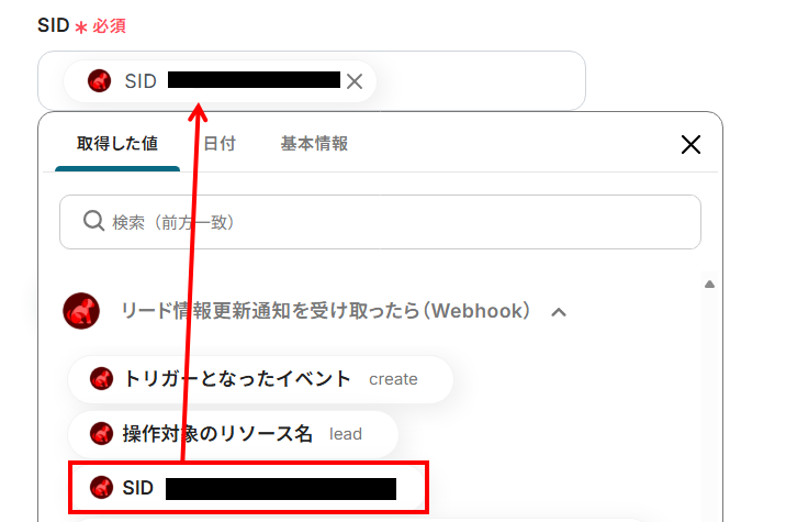 入力欄をクリックすると、下記のようなアウトプットが表示されるので、前のステップで取得したSIDを選択してください。