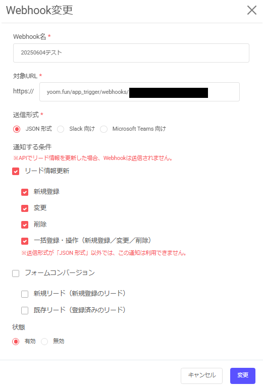 「Webhook名」には管理しやすい名前を入力してください。また、先ほどコピーしたWebhook URLを「対象URL」に入力、「通知する条件」にはリード情報更新を選択しました。入力が完了したら、「変更」を押して進みましょう。