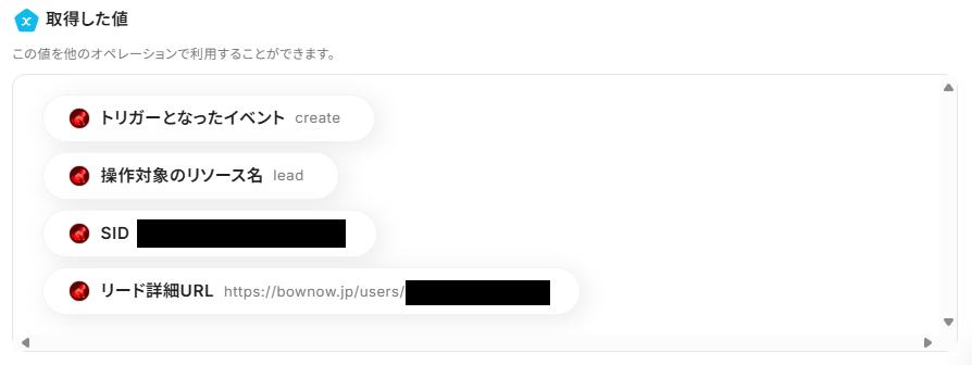 下記のようなアウトプットが表示され、BowNowのリード情報が反映していればOKです!