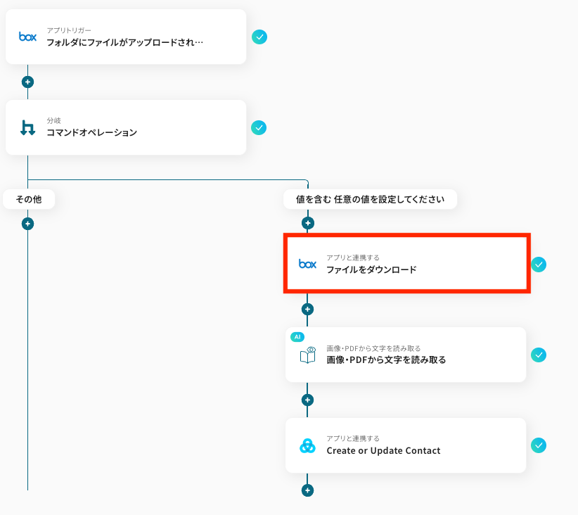 このワークフローを活用すれば、Boxに特定のファイルがアップロードされるだけで、OCR機能が文字情報を自動で読み取り、GistへContact情報として登録までを自動化できるため、GistとBoxを連携させた効率的な顧客情報管理を実現します。