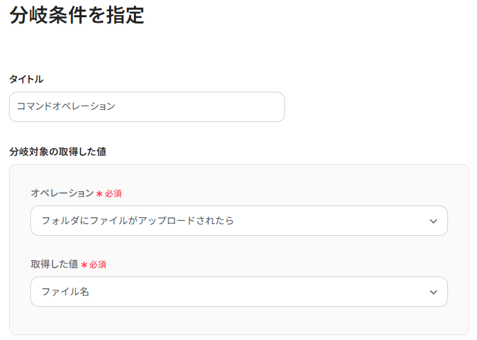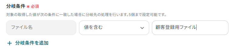 右の入力欄には、ファイル名にどんな値が含まれているとき分岐したいか入力してください。