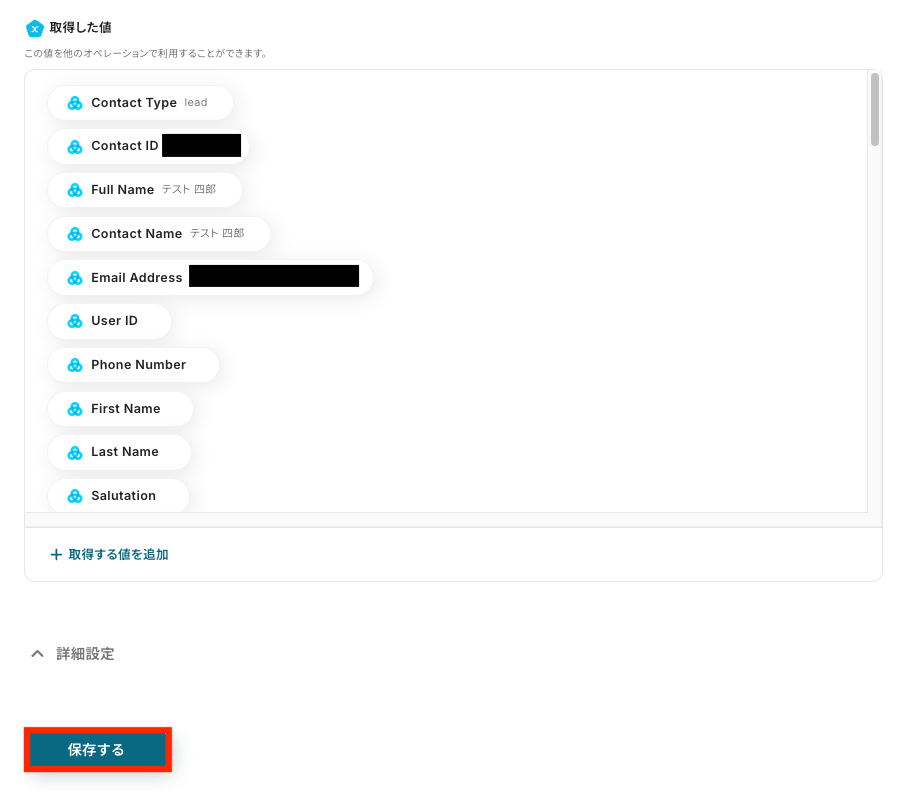 YoomのGist「Create or Update Contact」でcustom_fieldsへマッピングし、会社名や役職などを割当てて保存できます。