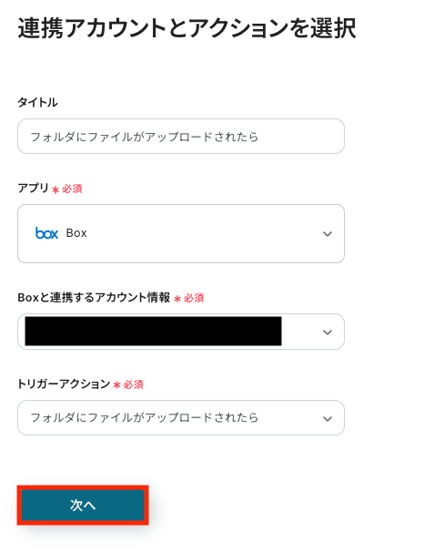 ・Google DriveにPDFファイルがアップロードされたら、boxの指定フォルダにそのファイルを連携するフローです。