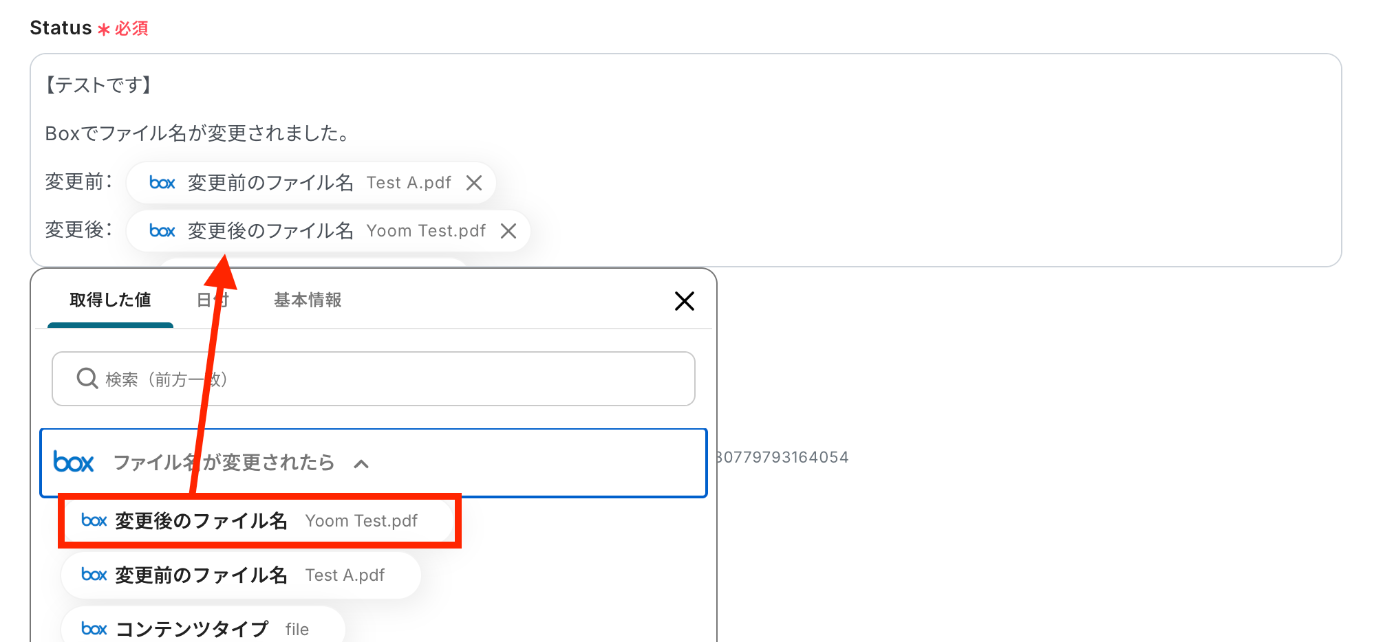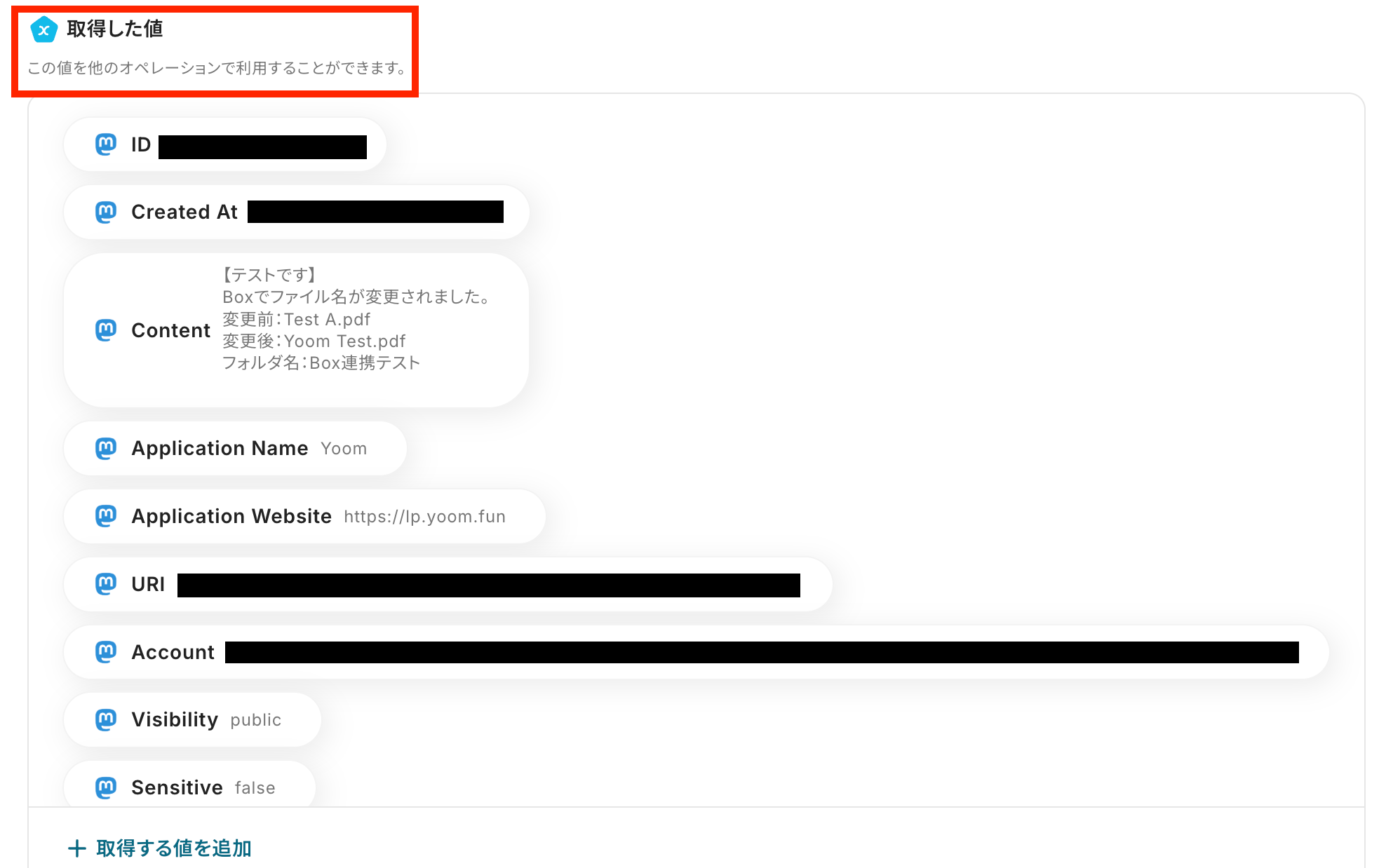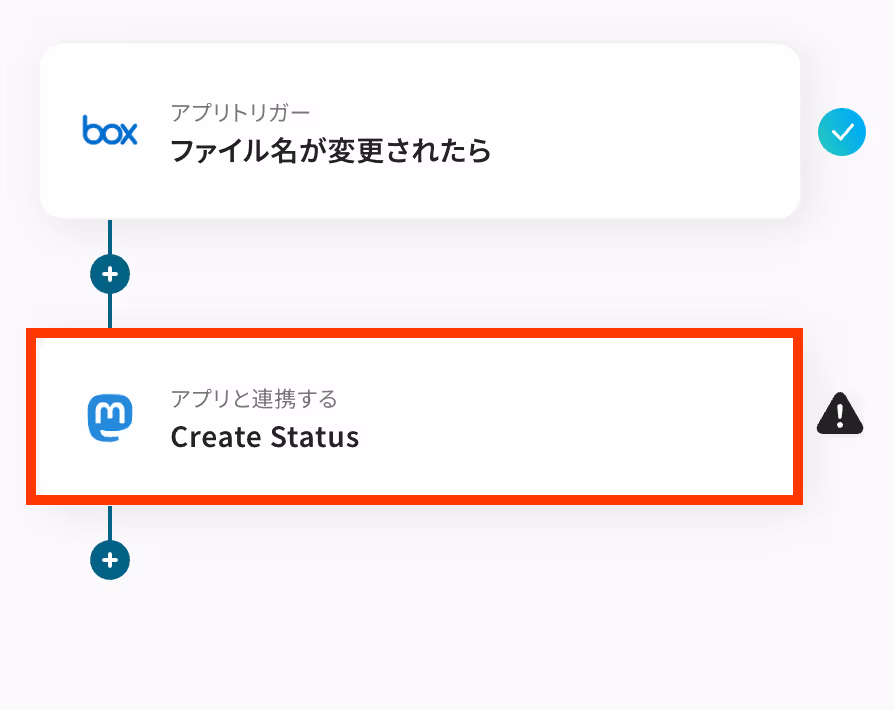 Boxから取得した値を利用して、Mastodonでステータスを作成する設定を行います。