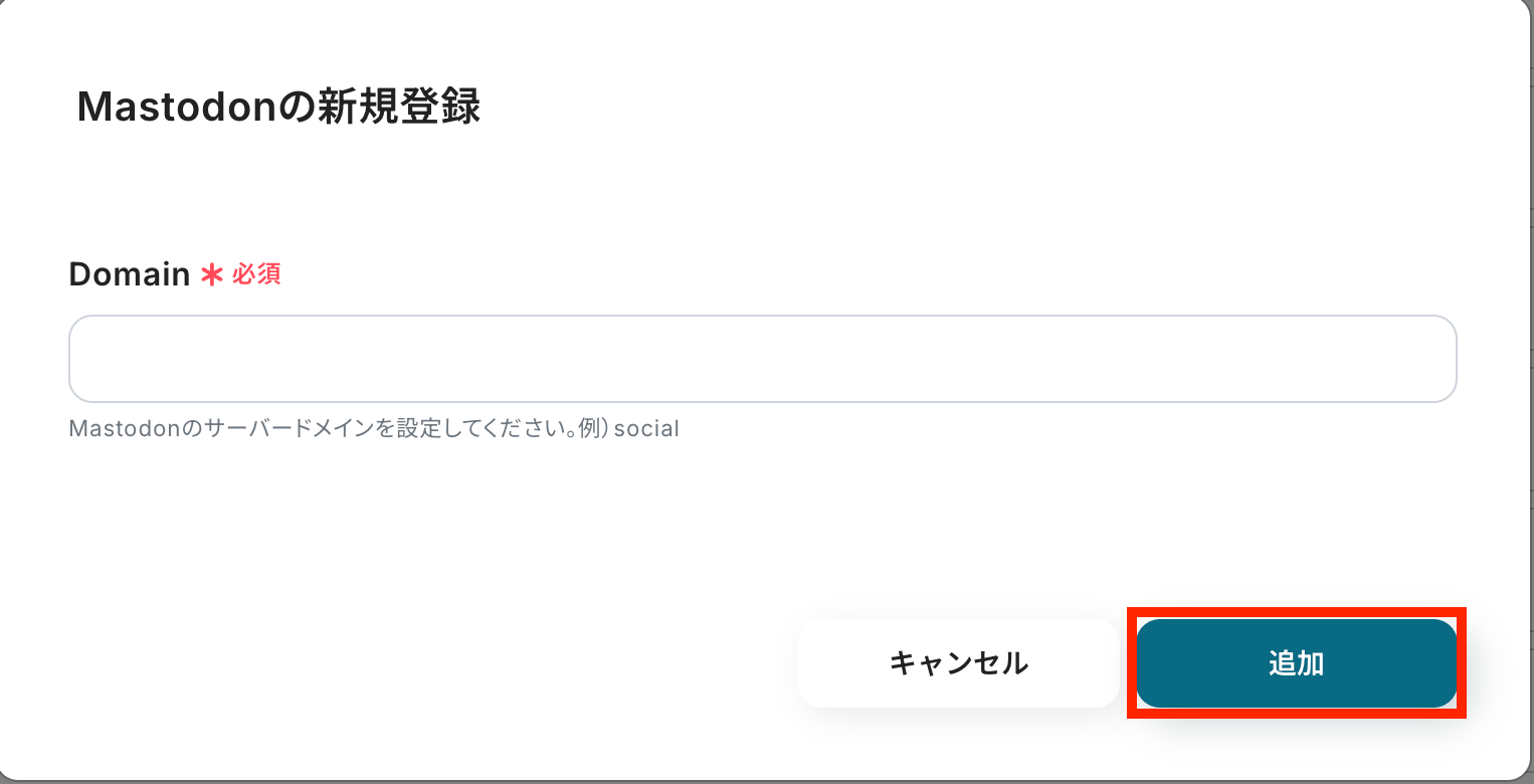 ドメインをMastodon上で確認して、空欄に記入したら「追加」ボタンを押します。