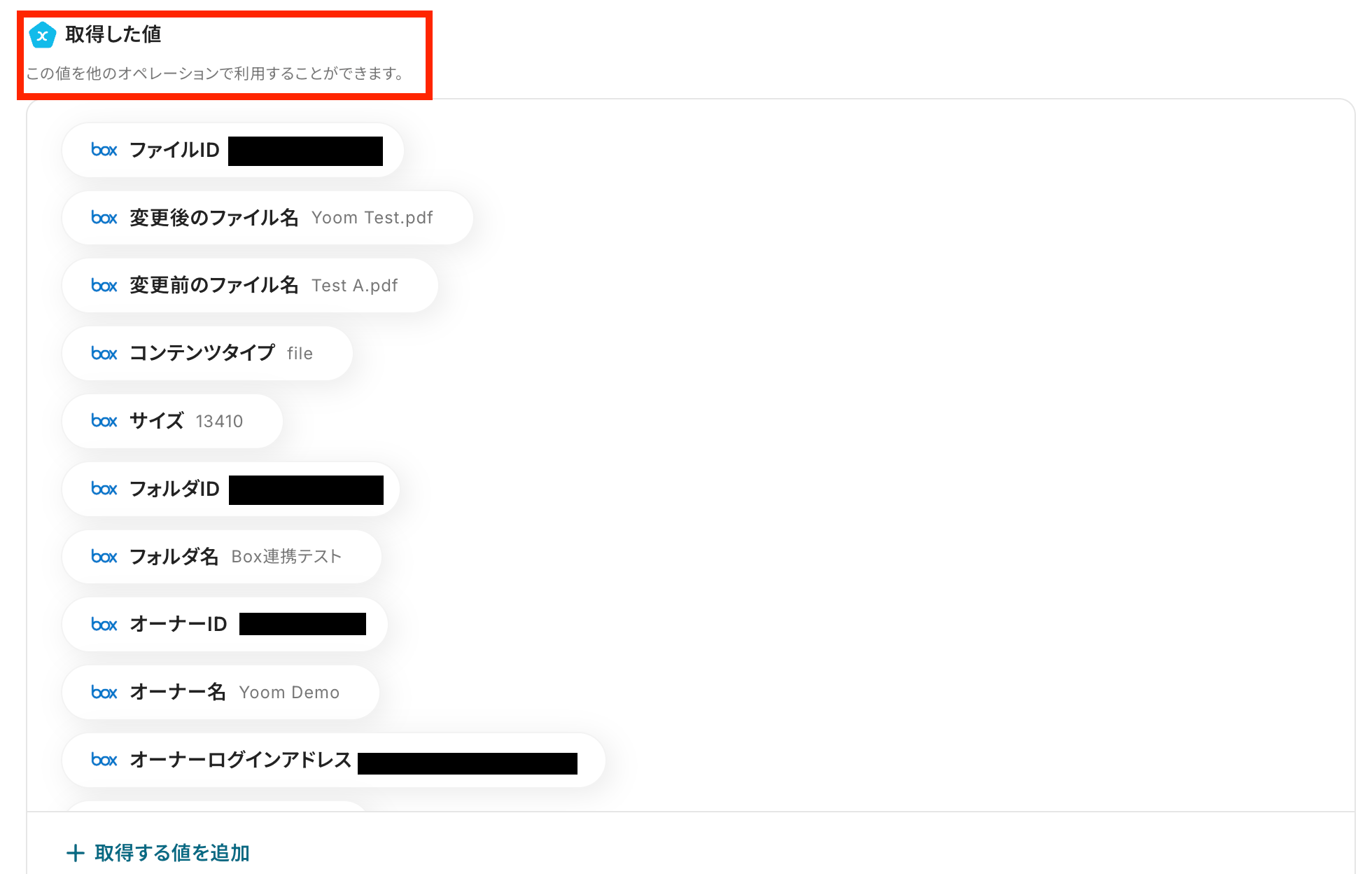 ※取得した値とは、トリガーやオペレーションにて受け取ったデータのことです。