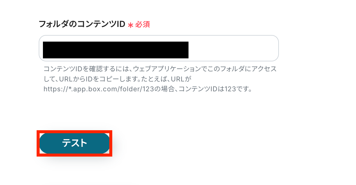 ファイルをアップロードしたフォルダのコンテンツIDを手動で設定したら、「テスト」ボタンを押しましょう。