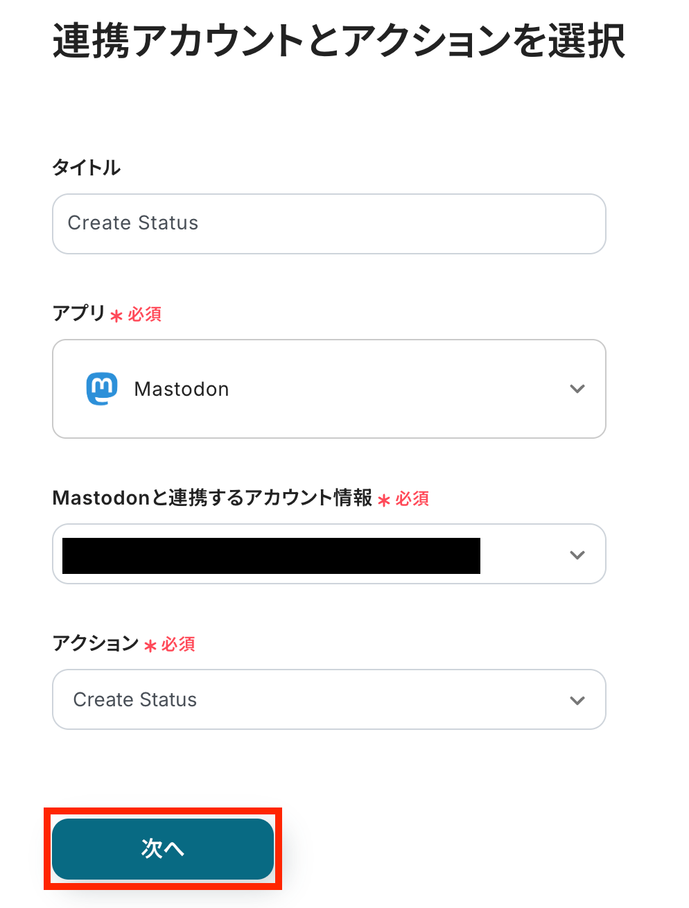 Mastodonと連携するアカウント情報に間違いがないかを確認します。
