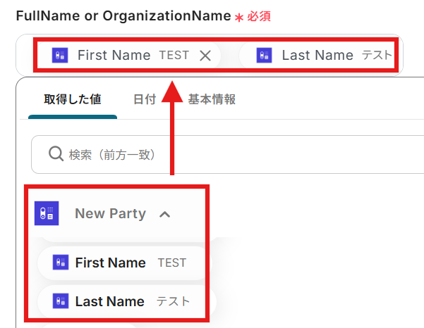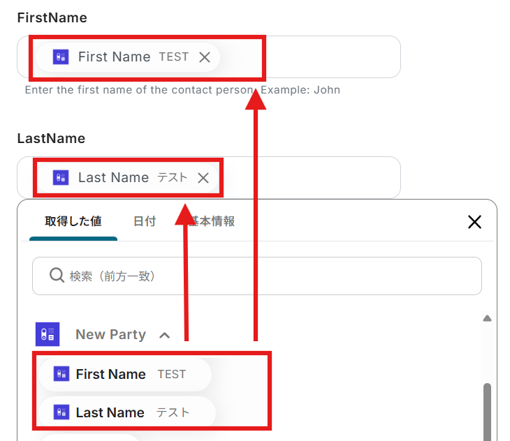 FirstNameとLastNameも同じく取得した値から選んで入力します。