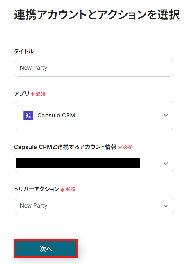 Capsule CRMのトリガー設定の際、トリガーアクションを「Updated Party」に変更して設定を進めていただくことで、連絡先情報の更新を連携することができます。