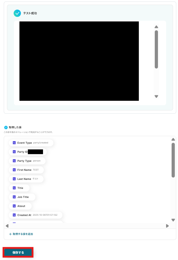 このように、取得した値を用いて設定することで、Capsule CRMでNew Partyが作成されるごとに、異なる値をXeroへ動的に反映できます。
