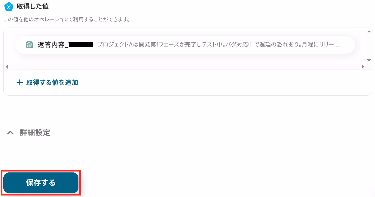 固定の文章や、ChatGPTの「返答内容」などの取得した値を組み合わせて自由にカスタマイズできます。