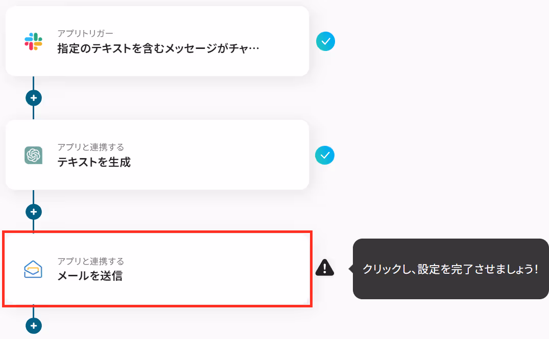 このテンプレートを使えば、Slackへの投稿をトリガーとして<span class="mark-yellow">ChatGPTが自動でメッセージ内容を要約し、その結果をZoho Mailで指定の担当者に通知</span>できます。