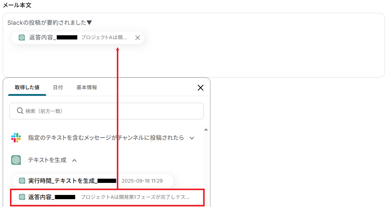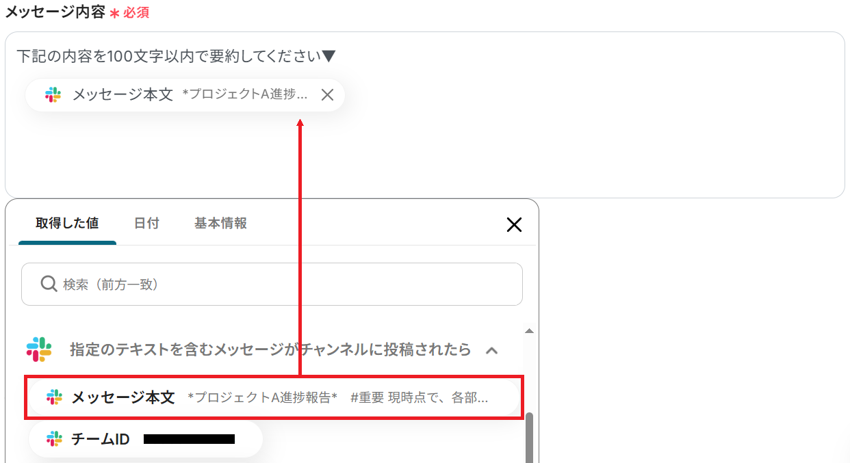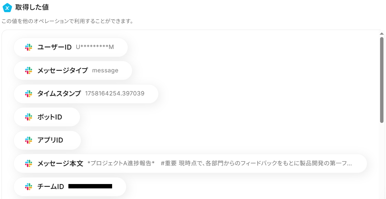 ※以下のようにSlackの「メッセージ本文」のアウトプットを設定することで、トリガーが実行されるたびに投稿された情報を反映できます。