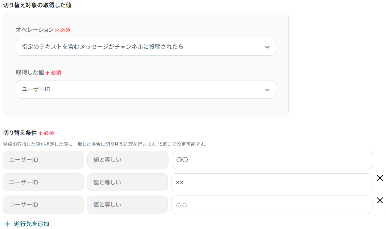 「ユーザーIDが特定のユーザーと等しい場合」などと設定することで進行先の切り替えができます。